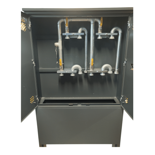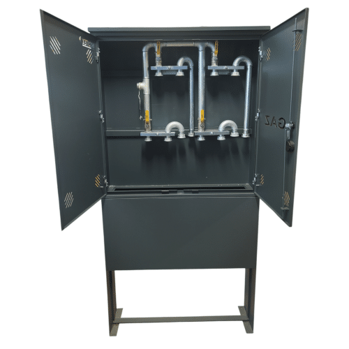 Szafka 4-G aluminiowa z monozłączami na 4 gazomierze wraz z postumentem do montażu w linii ogrodzenia.