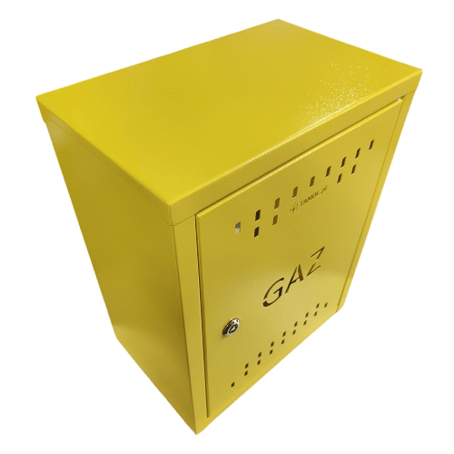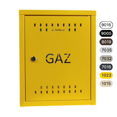 Szafka zamykana na zamek, posiada otwory wentylacyjne oraz oznaczenie GAZ.
